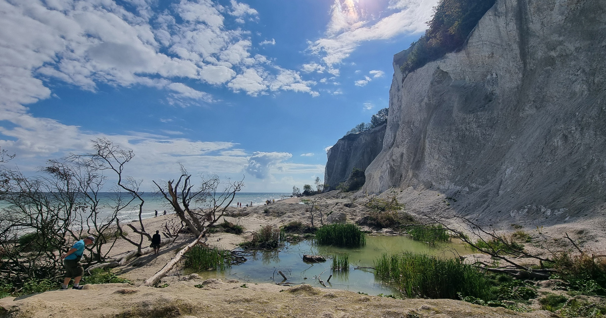Die Kreideküste ist ständig in Bewegung – Gestein bricht oft ohne Vorwarnung ab, wie 2005 die berühmten Wissower Klinken. Im unteren Bild siehst Du Abbrüche auf der Insel Møn. Deshalb gilt: Abstand halten, Warnschilder beachten und den Strandabschnitt nur bei sicherer Wetterlage betreten. Wer die Küste sicher genießen will, sollte dies von sicheren Aussichtspunkten oder vom Boot aus tun.